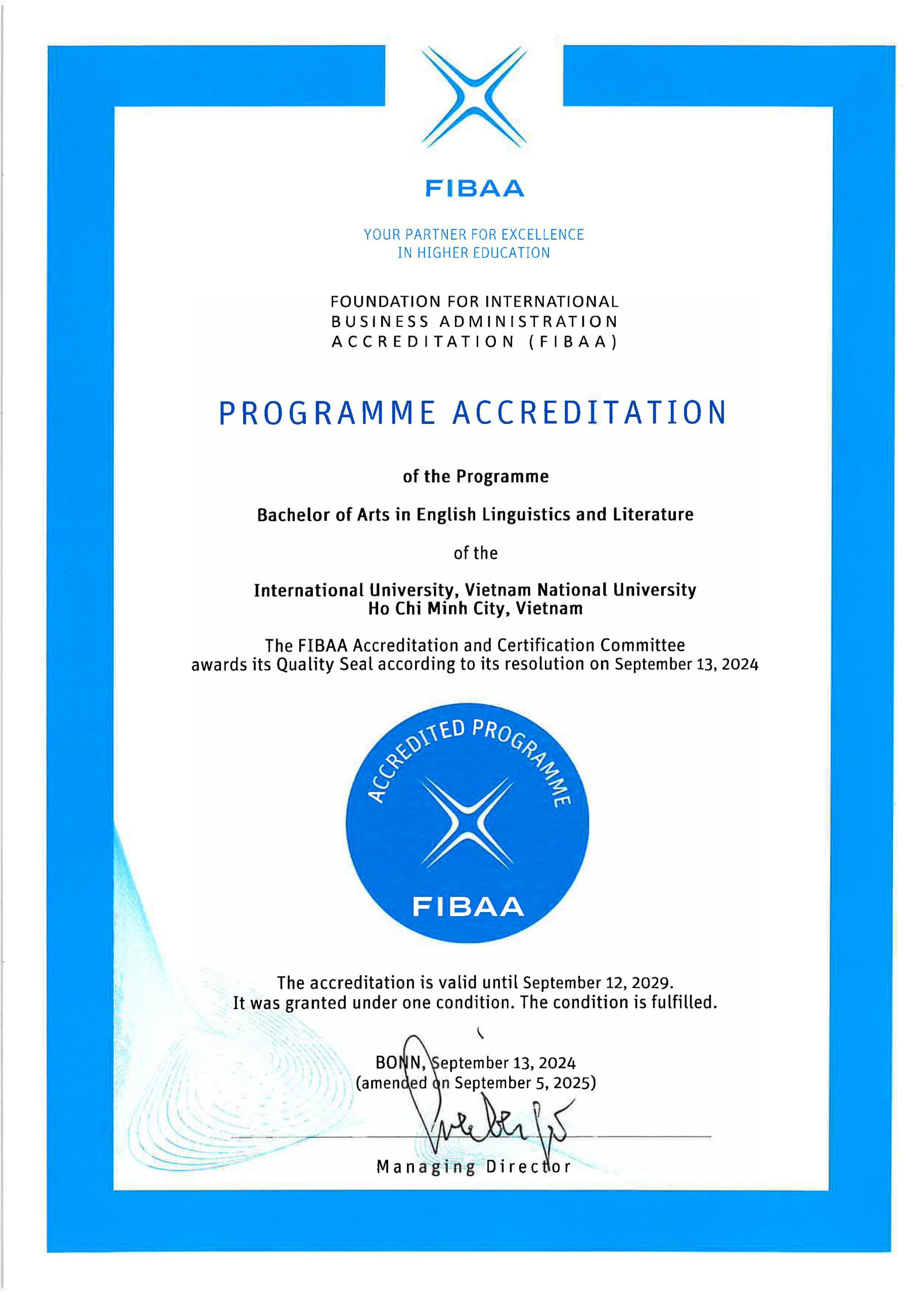 International University – Vietnam National University Ho Chi Minh City (IU–VNUHCM) is honored to announce that two of its undergraduate programmes have been formally granted accreditation by the FIBAA Accreditation and Certification Committee (F-ACC) for the maximum accreditation period of five years, valid from 13 September 2024 to 12 September 2029: